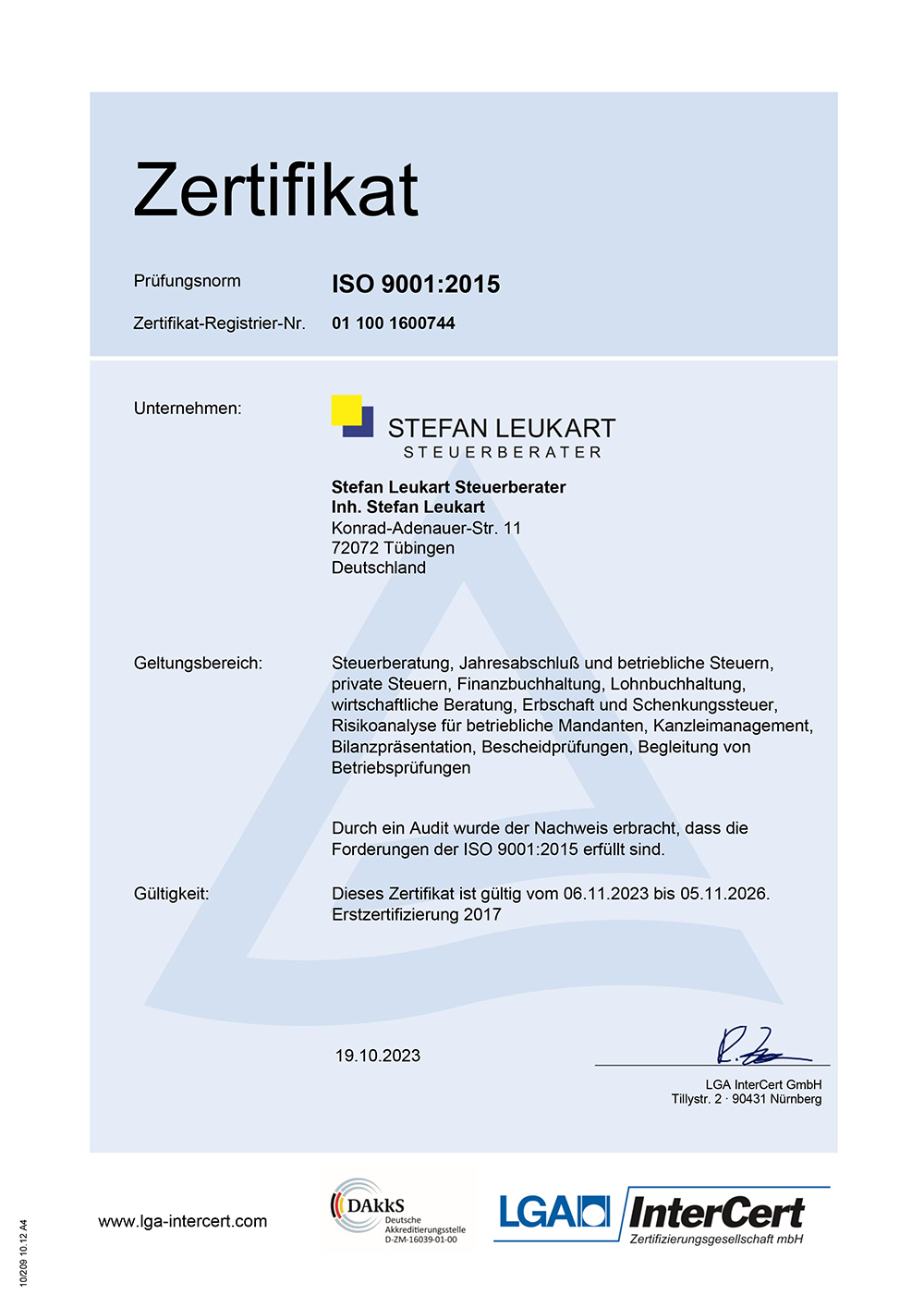 Im November 2017 haben wir als eine von wenigen Kanzleien in der Region Tübingen/Reutlingen die ISO 9001 Zertifizierung erhalten. Sie ist national und international die meist verbreitete und bedeutendste Norm im Bereich des Qualitätsmanagements. Das Siegel erhöht die Transparenz der betrieblichen Abläufe, ermöglicht eine noch höhere Kundenzufriedenheit und senkt die Fehlerquoten deutlich. Wir sind somit geprüfter Dienstleister. Dies zahlt sich auch für unsere Mandanten aus! Durch strukturierte Organisationsabläufe stehen unseren Mandanten noch schneller aktuelle Zahlen und Daten zur Verfügung. Interne Audits, permanente Qualitätskontrollen- und verbesserungen machen die Arbeit der Kanzlei noch effizienter. Als zertifizierte Kanzlei erfahren wir zudem eine noch höhere Akzeptanz bei Banken, Unternehmensberatungen und den Finanzbehörden - wovon auch Sie als unser Mandant profitieren!